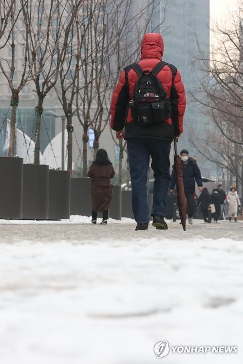 A pedestrian walks on a sidewalk covered in snow in Seoul on Dec. 21, 2022. (Yonhap)